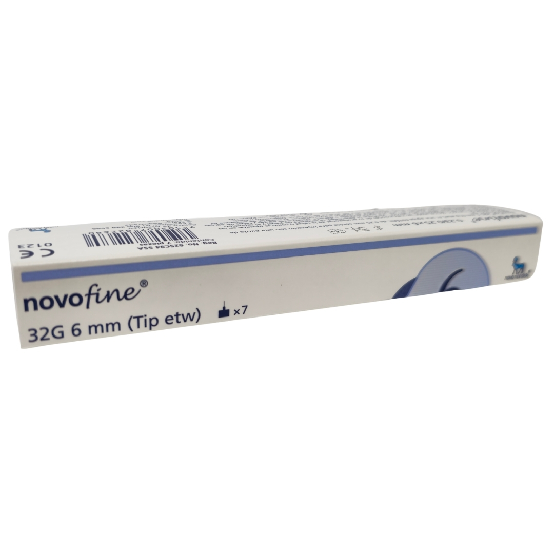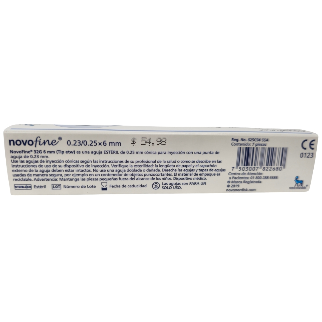 Agujas Novofine 32G x 6 mm (7 piezas) Aguja para administración subcutánea 32g Tip etw ( extrafina) 0.23/0.25 x 6mm Desechar de forma segura en contenedores para objetos punzocortantes. Mantener en lugar seco y a temperatura ambiente. No reutilizar la aguja para evitar infecciones. Mantener fuera del alcance de niños.