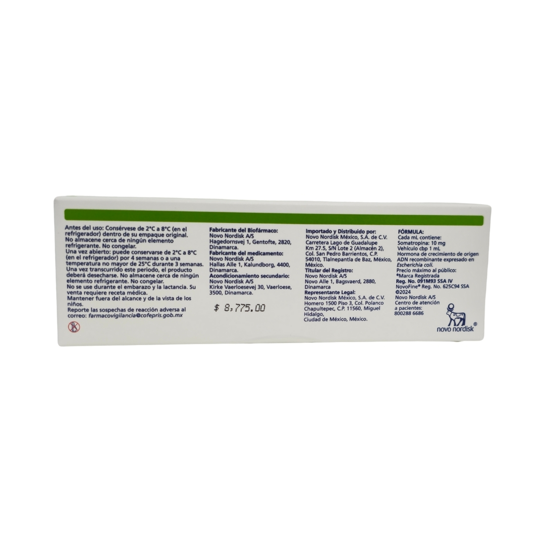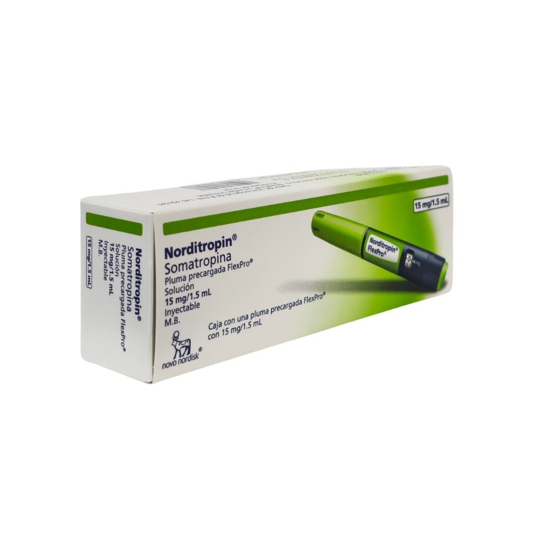 Norditropin FlexPro 45 UI .  La pluma  precargada contiene Somatropina ( hormona de crecimiento humana ) 15mg / 1.5 ml. La pluma FlexPro ofrece un diseño ergonómico y fácil manejo, permitiendo la administración precisa de hasta 45 UI (15 mg) por dispositivo, lo que asegura comodidad y adherencia al tratamiento. Indicaciones principales: Uso supervisado bajo indicación médica endocrinológica. Precauciones: Mantener refrigerado entre 2°C y 8°C, evitar congelación. Seguir indicaciones médicas para dosis y administración.
